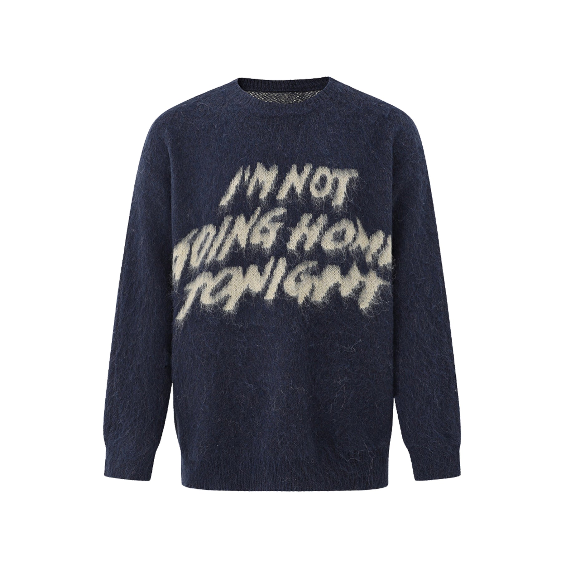 UNLOCK YOUR DRIP. A cozy sweater with attitude. Made from a soft fuzzy knit, it features the bold phrase “I’m Not Going Home Tonight” splashed across the front. Easy to throw on, super comfortable, and perfect for when you want your outfit to do the talking. Available in brown, pink, and navy for different moods.